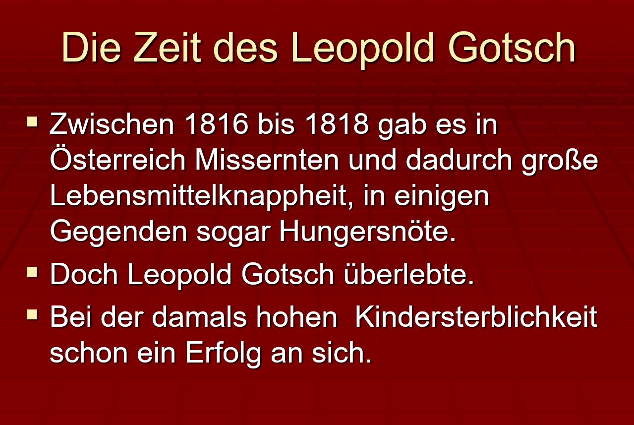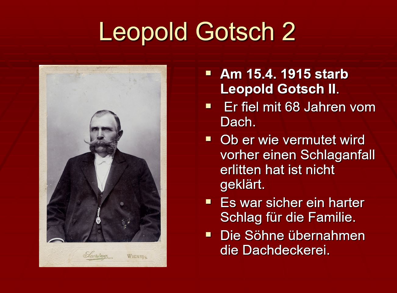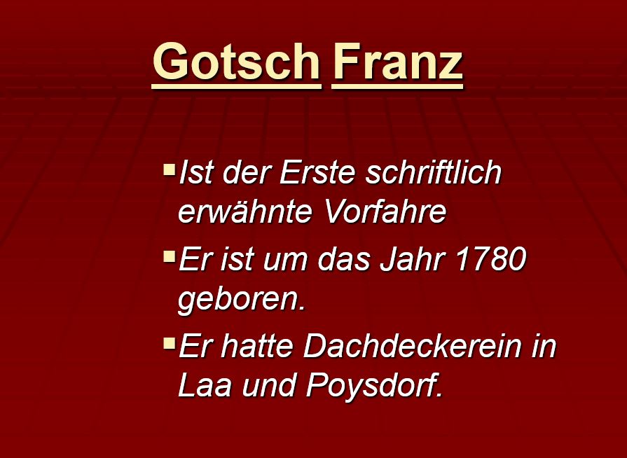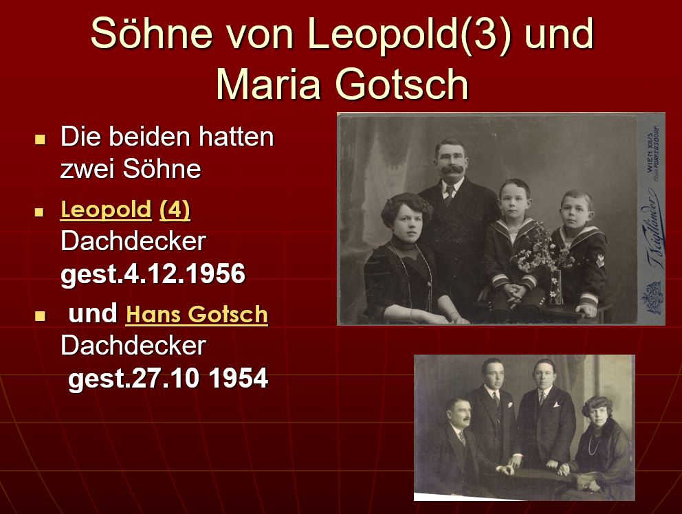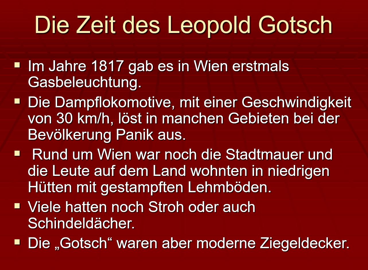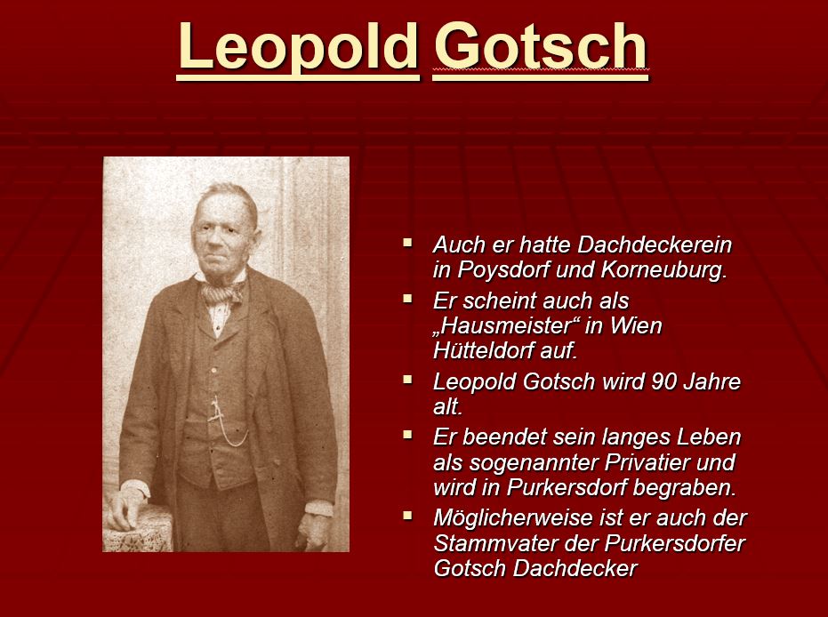 Die Wurzeln unseres geschichtsträchtigen Betriebs reichen bis ins 18. Jahrhundert zurück. 1909 ist ein Dachdeckermeisterbetrieb in der Lainzer Straße 125 belegt, gegründet von Leopold Gotsch. Seine beiden Söhne – Leopold jun. und Johann Gotsch – wurden ebenfalls Dachdecker, wobei Johann 1932 eine weitere Dachdeckerei in Hetzendorf eröffnete und Leopold den Betrieb in Lainz übernahm.